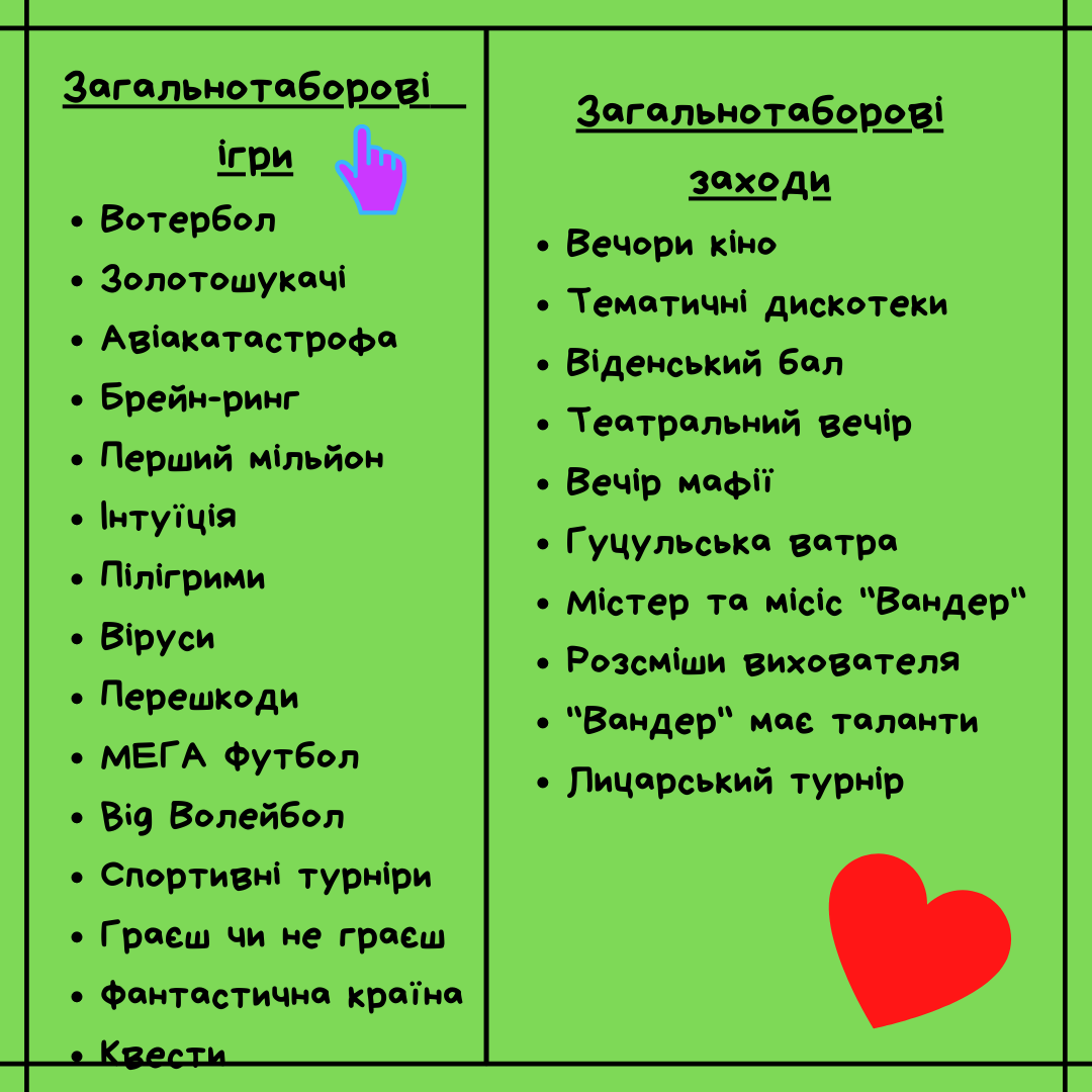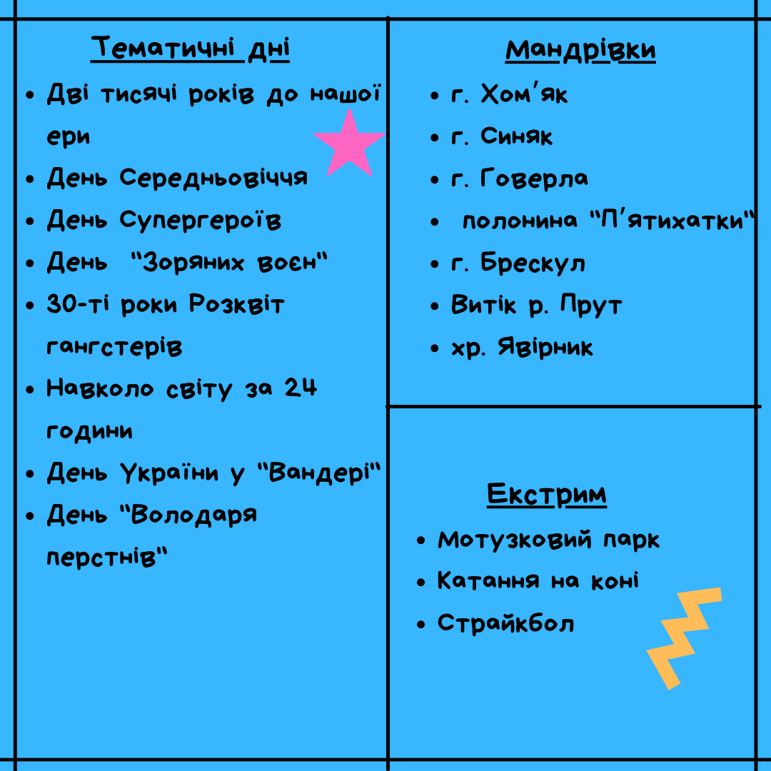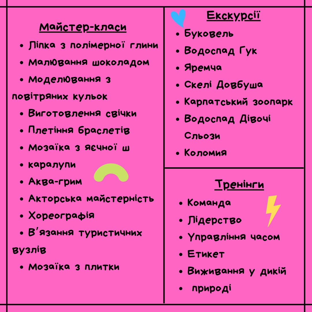– вся розважально – педагогічна програма табору: ігри, майстер-класи, тренінги, екскурсії…;