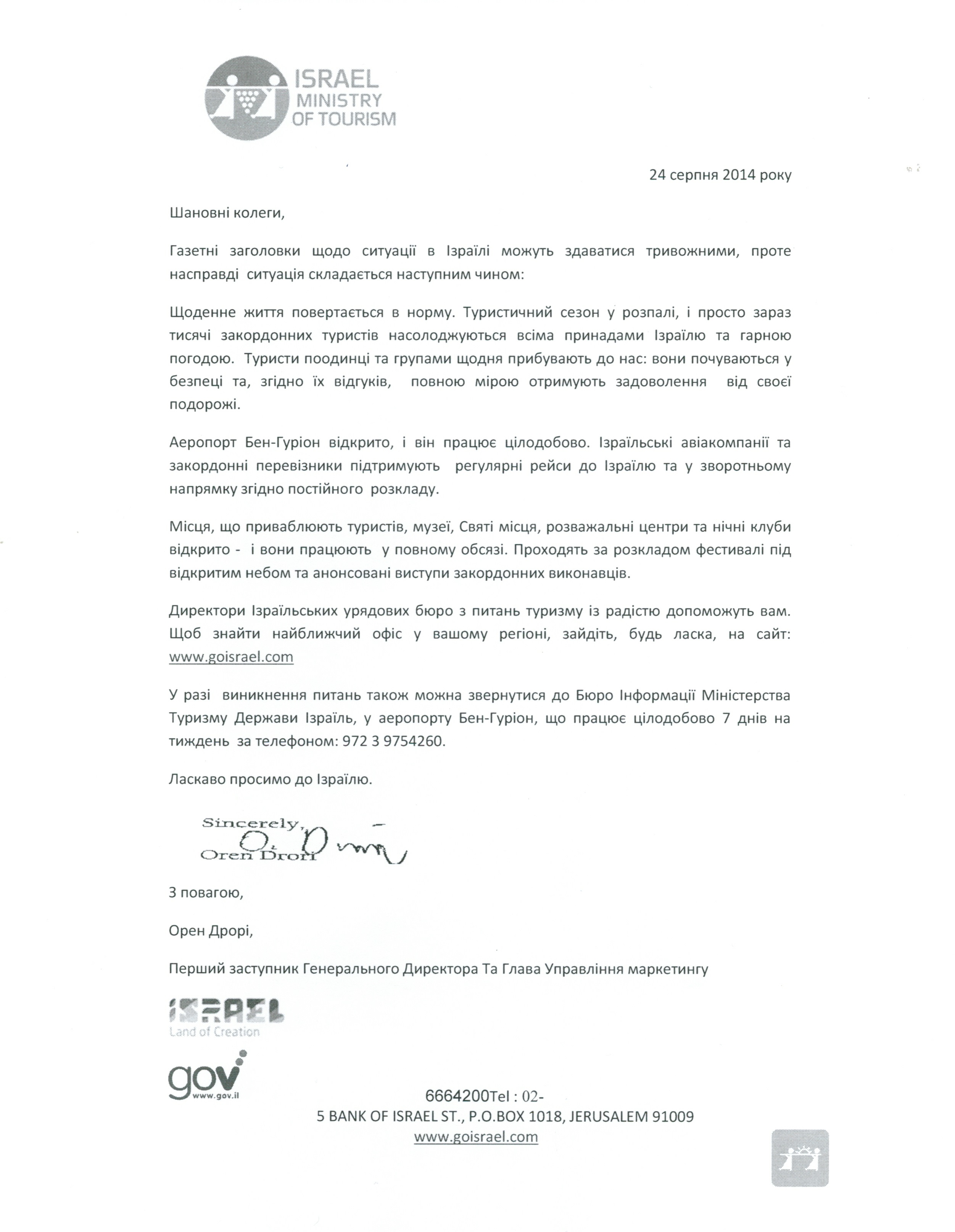 Бюро інформації Міністерства туризму держави Ізраїль звернулося до прочан та мандрівників, які збираються відвідати Святу Землю, з запевненням стабільності ситуації в державі. «Туристи поодинці та групами щодня прибувають до нас: вони почуваються безпечно та отримують задоволення від своєї подорожі», – йдеться в листі.