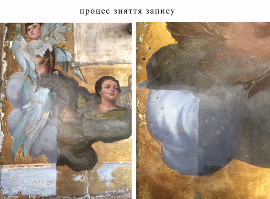 Після того як методика і розчинники було підібрано довготривалий клопіткий процес зняття запису було розпочато. Неспішучи шар за шаром, фрагмент за фрагментом знімалося пізніші записи. В процесі було виявлено що Лик Богородиці місцями було тричі перемальовано, поправлено. Запис знімалося ватним тампончиком намотаним на паличку замоний в розчиник і круговими рухами, акуратно слідкуючи, щоб не зняти жодного зайвого шару. Спочатку запис знімалося з менш відповідальних місць з тла, одягу, хмар. Коли методика була відпрацьовано досконало приступилося до зняття запису з ликів ангелів, а тоді Богородиці.