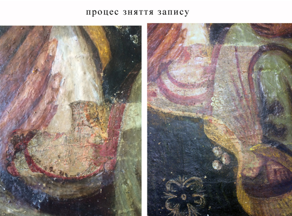 В процесі зняття запису з лику Богородиці постійно звірювалося з рентген знимкою. В процесі зняття було виявлено, що авторський ніс значно довший і губи значно менші, крім того з країв було відкрито білий омофор, який на пізніших шарах було замальовано. Лик став значно витягнутішим, строгішим. Кольорова гама також досить змінилася, з яскравих рожевих кольорів притаманних ХХ ст. і низькій якості живопису відкрився складний колір, мальований на санкирі, характерний оливковий колір який служив тіньовими партіями в іконописі 15-17ст. в процесі зняття запису було також відкрито орнамент оздоби одягу і головне – техніка виконання- темпера. Це відкриття свідчило про давнє походження ікони. Саме такою технікою і в подібній манері малювали ікони іконописці 16-17 ст. про те ці ікони було зображено переважно на дерев’яній основі. Про те що ікона мальована вже на домотканому полотні, могло свідчити два факти, вона була мальована як хатня ікона(мальована для домашнього вжитку) і близькість з європейськими традиціями які на полотні малювали вже довший час.