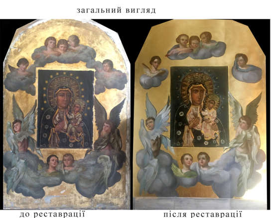 На реставрацію ікону передано 30 серпня 2019 року. За першим оглядом ікони було виявлено, що ікону кілька разів перемальовували, вірогідно всього в другій половині ХХ ст. Найбільше зацікавив той факт, що центральна частина Ікони, власне саме зображення Божої Матері було окремо наклеєне. Під нього було вирізано акуратно грунт ікони і в центральне місце було наклеєно образ Божої Матері намальований на полотні. На той час ми не могли розгадати цієї загадки, бо з подібним вирішення стикнулися вперше.